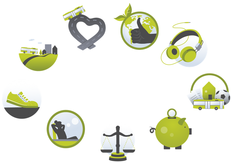 Att åka buss bidrar också till en bättre stadsmiljö och hälsa. Färre fordon i trafiken ger både lägre trafikbuller och mindre avgaser för dig att andas in.